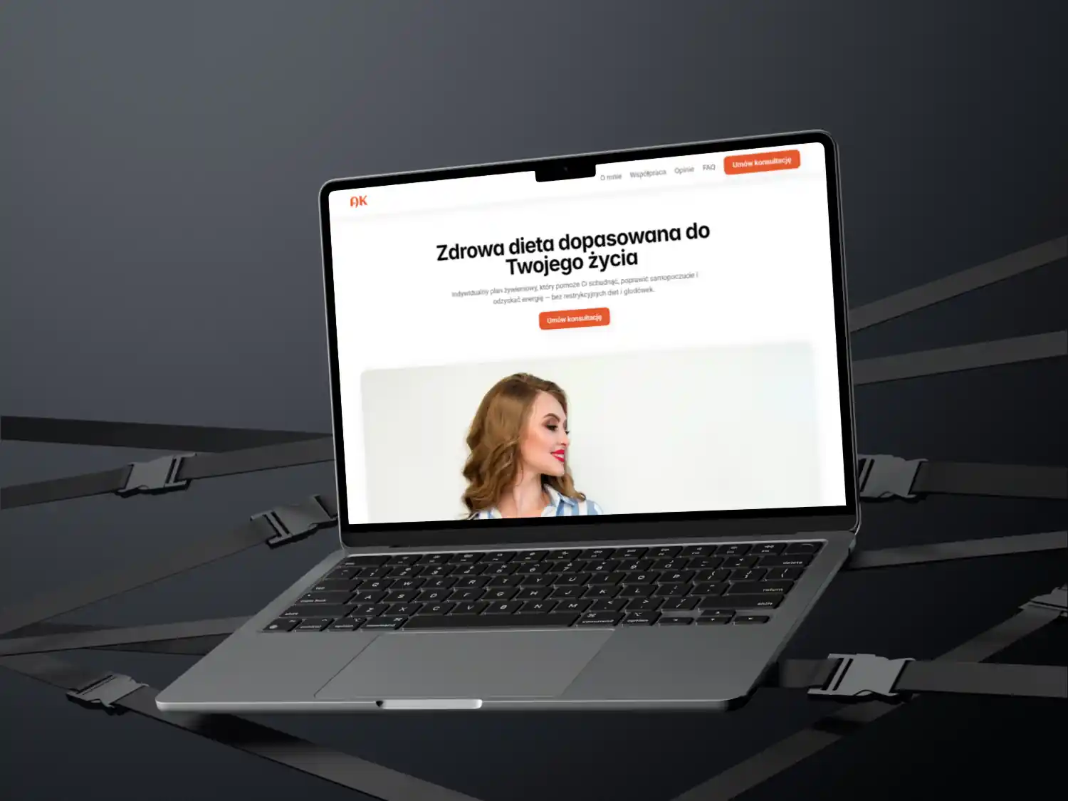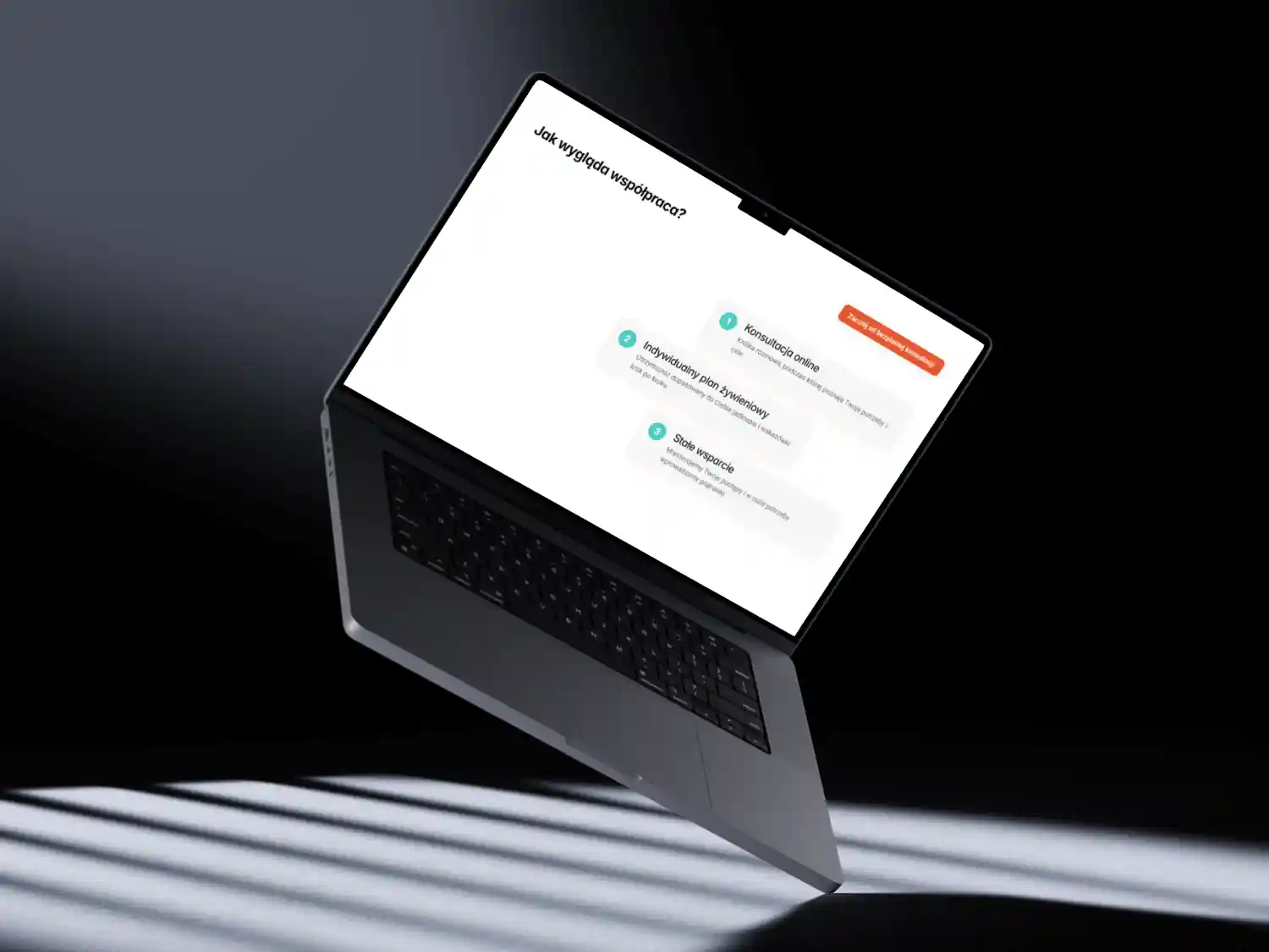 Przeanalizowałem typowe potrzeby klientów dietetycznych (szybki dostęp do konsultacji, prosta prezentacja oferty, wiarygodność). Opracowałem design system (paleta kolorów, typografia, spacing), przygotowałem treści sekcji (hero, 3 kroki współpracy, opinie, FAQ, formularz kontaktowy). Projekt został wdrożony w Framerze z naciskiem na czytelność, prostą nawigację i konwersję.